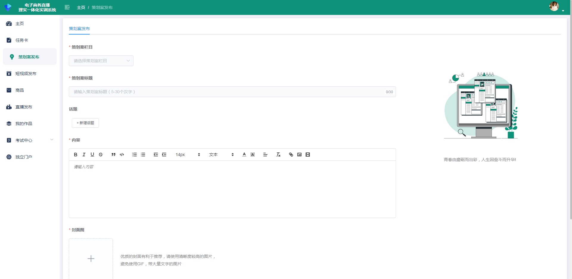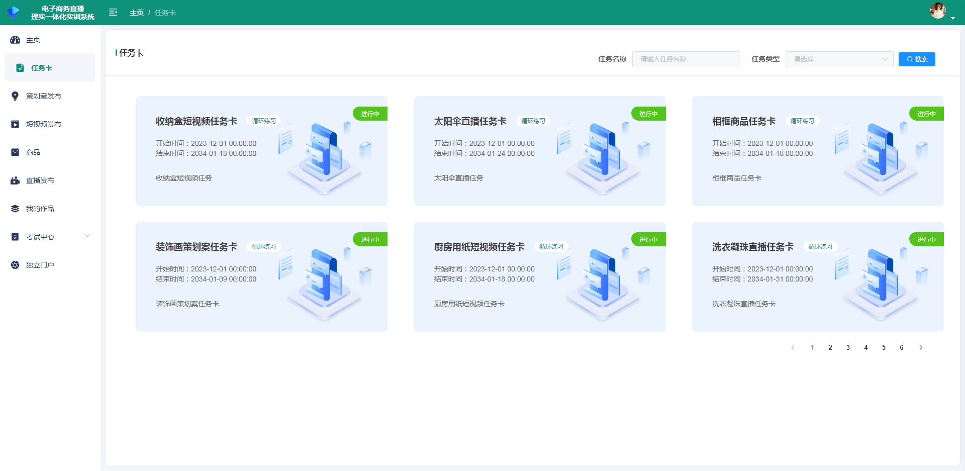 電子商務直播理實一體化實訓系統(tǒng)主要通過對短視頻、策劃案和直播的大量練習,為用戶積累大量的電子商務直播經(jīng)驗。平臺用戶主要包括企業(yè)人員及院校教師和學生兩類,可通過對電子商務直播理實一體化實訓系統(tǒng)功能模塊的應用完成指定的工作及學習任務。電子商務直播平臺主要分為學生端與教師端,學生端功能主要包括主頁、任務中心、策劃案發(fā)布、短視頻發(fā)布、商品中心、直播發(fā)布、作品管理、考試中心、獨立門戶等功能模塊。